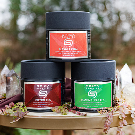 This collection features the synergistic power of premium organic teas and traditional spices working in harmony. ORGANIC JASMINE LEAF TEA combines delicate green tea leaves with fragrant jasmine flowers known for their aromatic and soothing properties. ORGANIC MASALA CHAI blends robust black tea with warming spices including cinnamon, cardamom, ginger, cloves, and black pepper—each known for their aromatic and comforting properties. ORGANIC PU'ERH TEA features aged, fermented tea leaves recognized for their distinctive earthy character and smooth, mellow profile. This intelligent, USDA Certified Organic collection features ingredients known for their aromatic, soothing, and comforting properties.